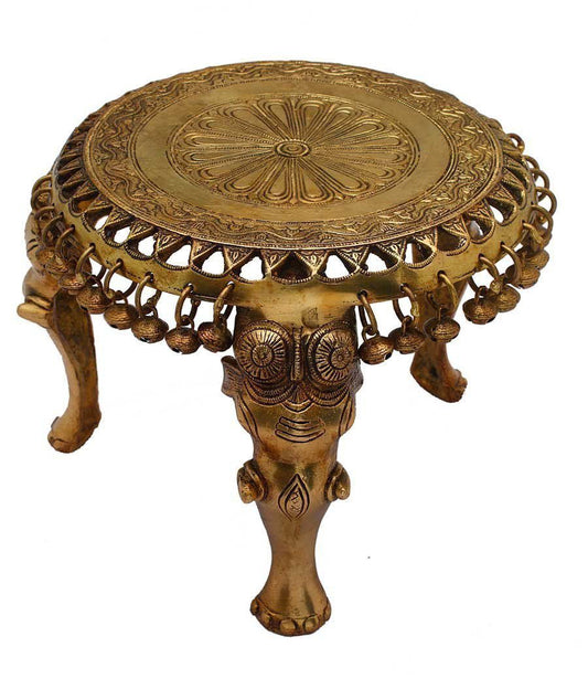 Elephant Pillar Design Handcrafted Brass Pooja Chowki with Bells, Antique Golden Color