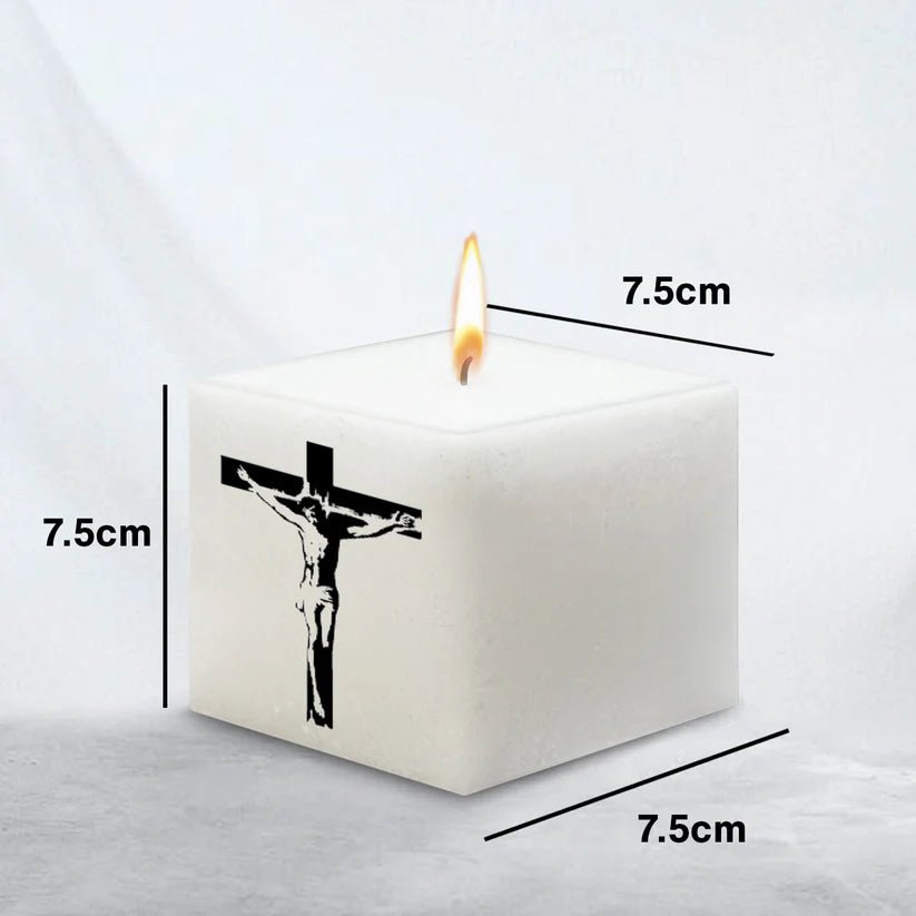 The candle measures 3x3x3 inches, making it a compact yet meaningful decorative piece.