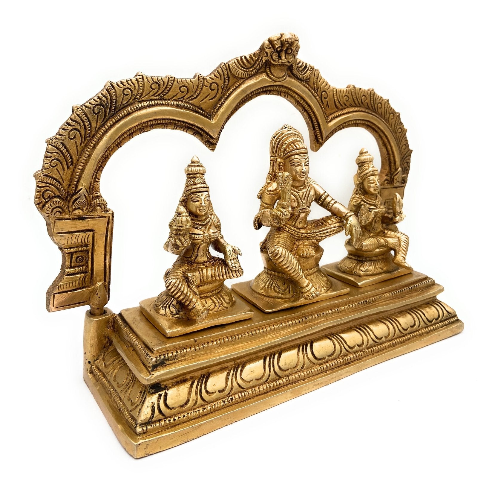 intricately crafted trio of Lord Aiyanar (Shasta) with consorts Poorna and Pushkala, seated on a peetam (base) within a prabhavali (arched backdrop)