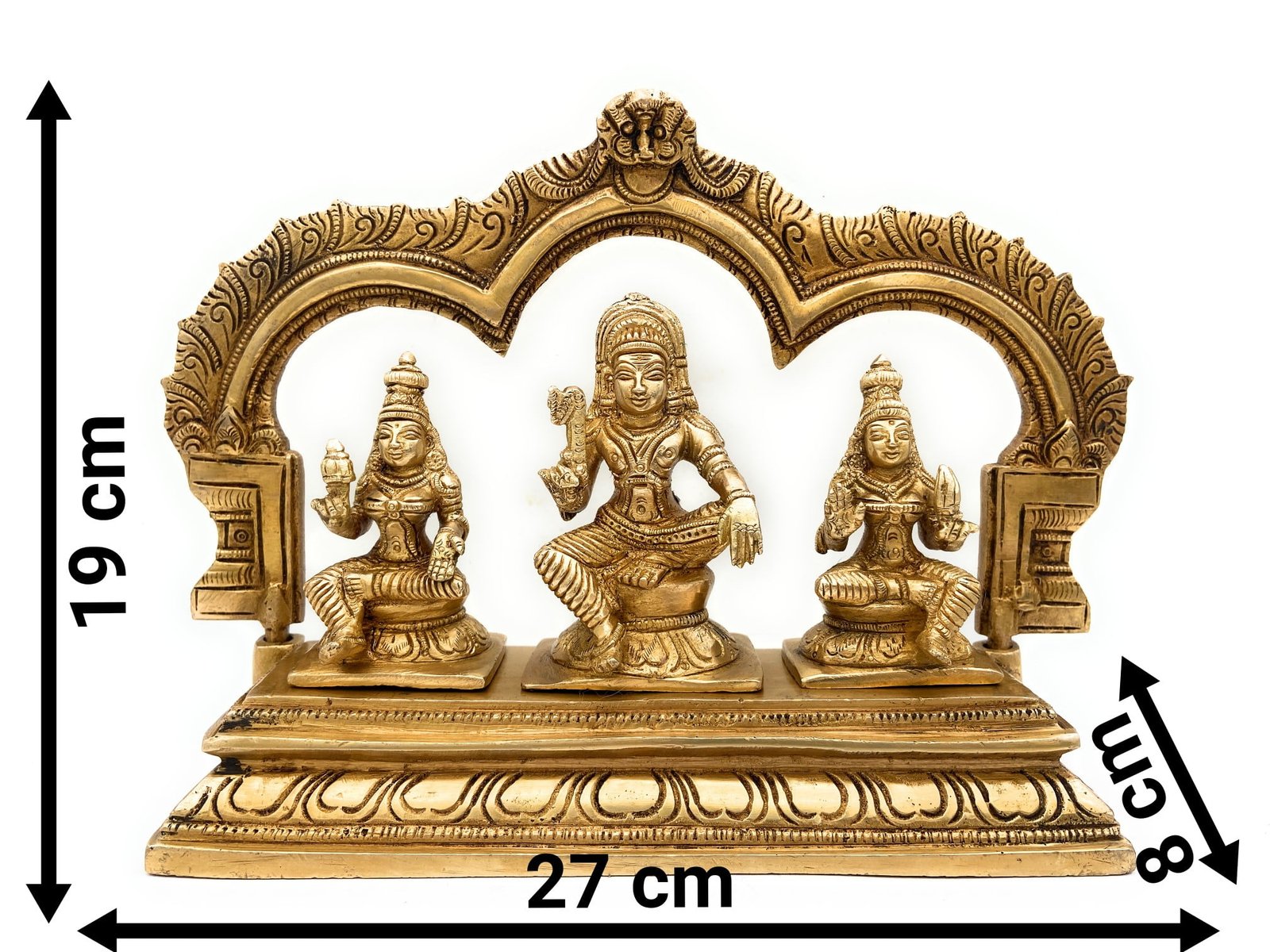 Celebrate South India’s rich spiritual heritage with this handcrafted brass trio of Lord Aiyanar (guardian deity), flanked by consorts Poorna (fulfillment) and Pushkala (nourishment), all under an ornate Prabhavali (halo arch) symbolizing divine protection