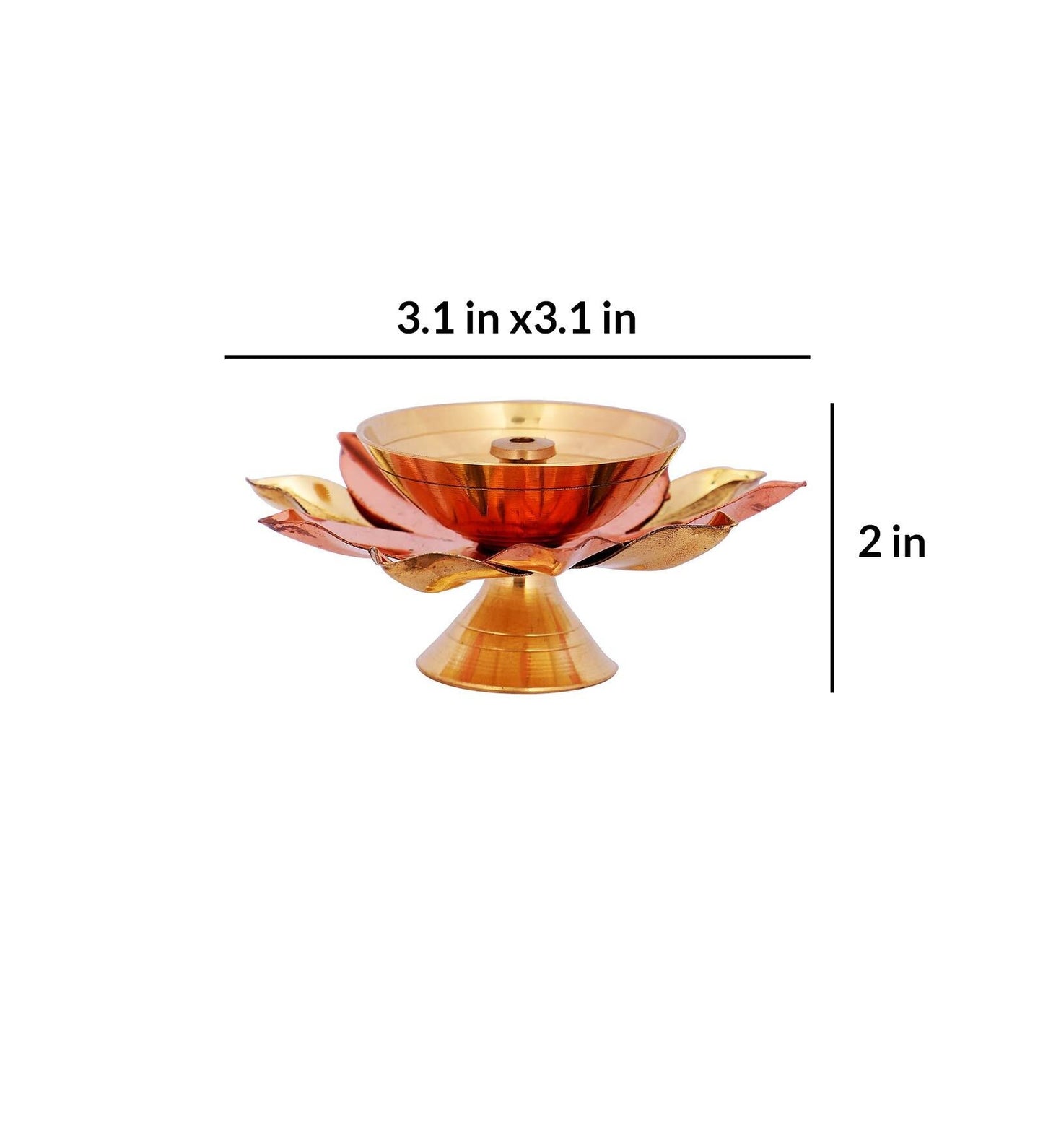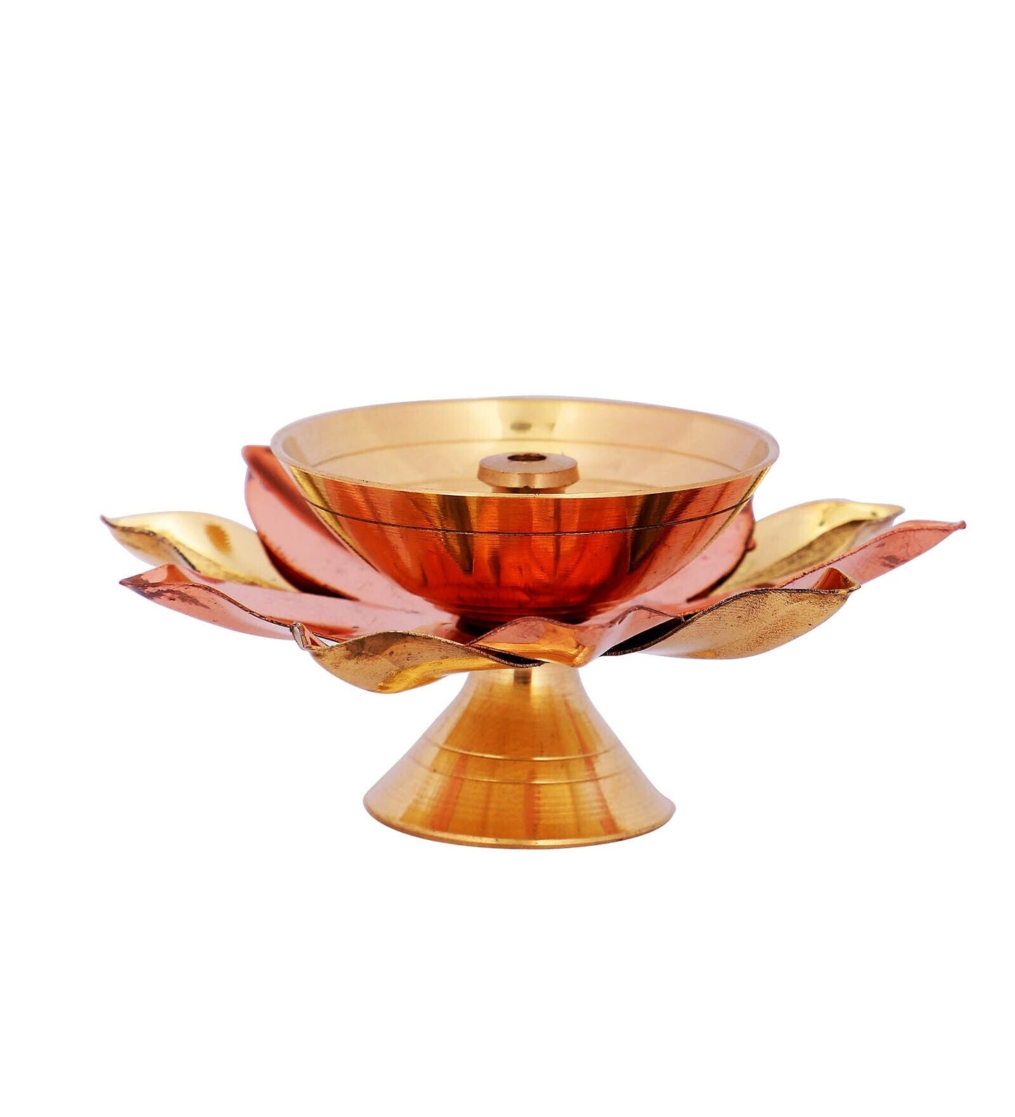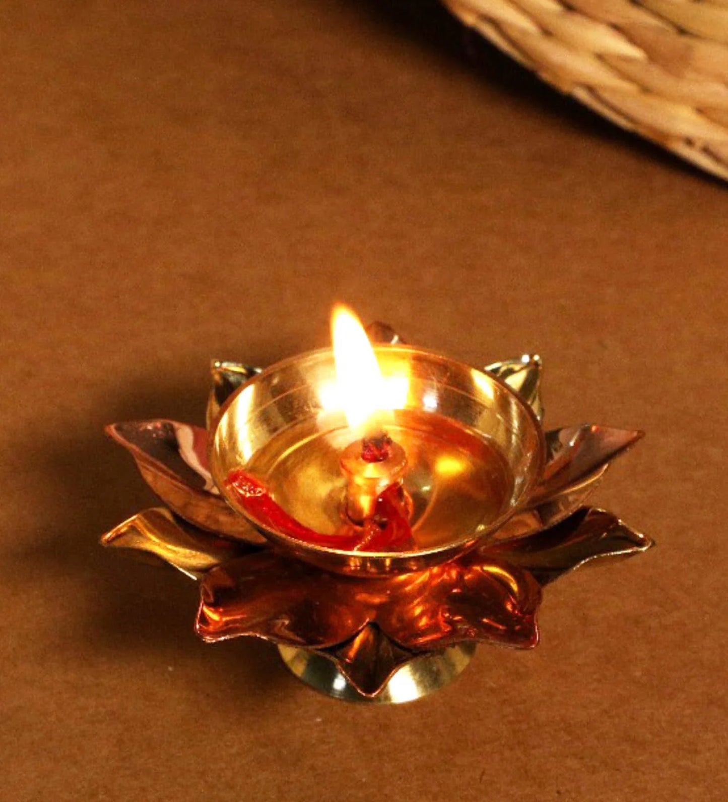 This meticulously crafted diya, in the shape of a lotus flower, serves as both a decorative piece for your home decor and a functional oil lamp, symbolizing purity, divinity, and cultural richness.The diya is intricately designed in the shape of lotus flower petals, symbolizing purity and enlightenment in Indian culture. The lotus design adds an aura of grace and spirituality to your living space. Crafted from high quality brass and copper, this diya showcases exceptional craftsmanship. The combination of brass and copper not only imparts a radiant golden and coppery hue but also ensures durability, promising a cherished decor piece for years to come.This diya serves both as an exquisite piece of decor and a functional oil lamp.