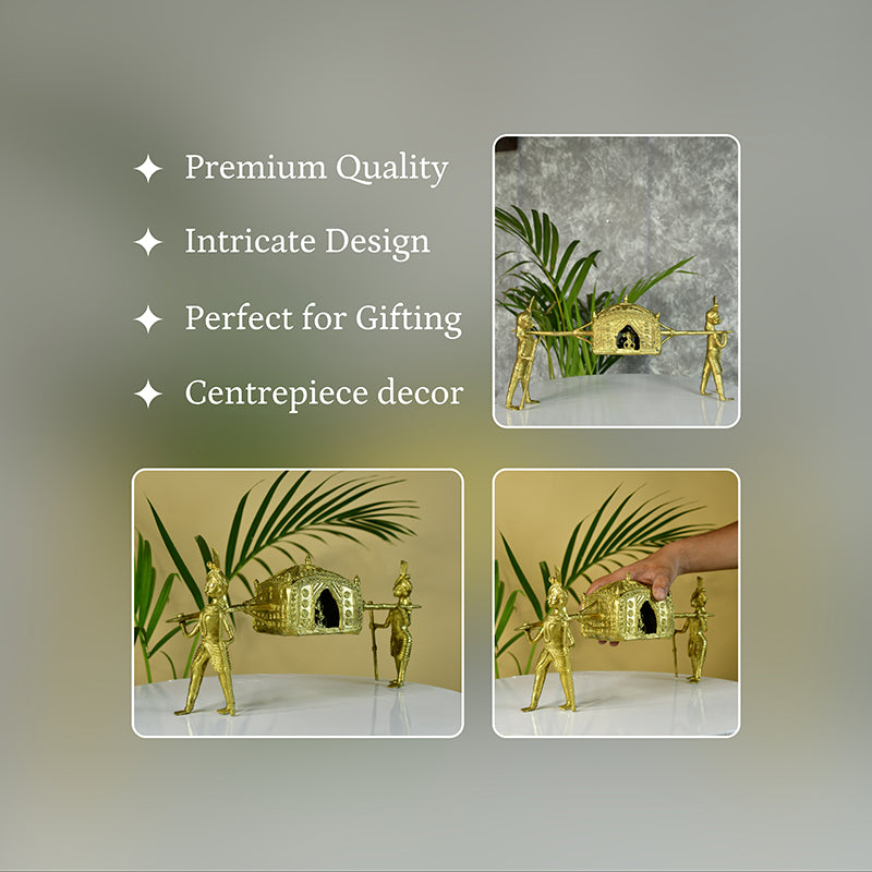Looking for a unique piece to spice up your decor? This brass figurine is just the ticket. Two detailed figures hold up a palanquin like something straight out of a fairy tale. Who wouldn't love a touch of gold that feels like a whisper from the past? And let me tell you, it's got that artisan charm that makes you feel a bit fancy. Perfect for those Sunday chai moments, with the windows open, letting in the morning breeze.