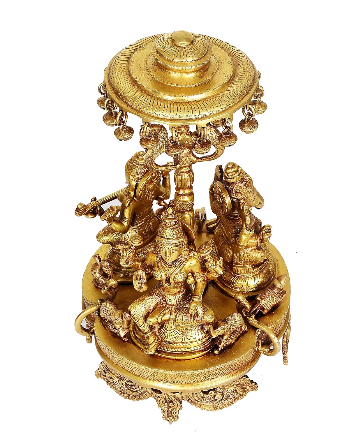 Brass Lakshmi, Ganesha and Saraswati on Chowki with Temple Umbrella Statue
