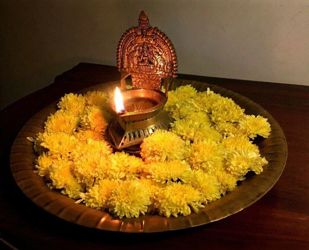 - This diya is adorned with intricate detailing and craftsmanship, paying homage to Sri Kamachi Amman, a revered Hindu deity associated with prosperity and protection. The golden brass finish adds a touch of sacred elegance to your home and serves as a constant reminder of your faith and devotion.