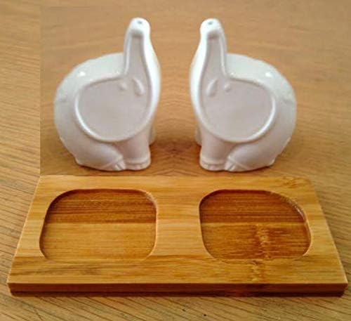 Ceramic Elephants Salt and Pepper Shakers with Bamboo Tray