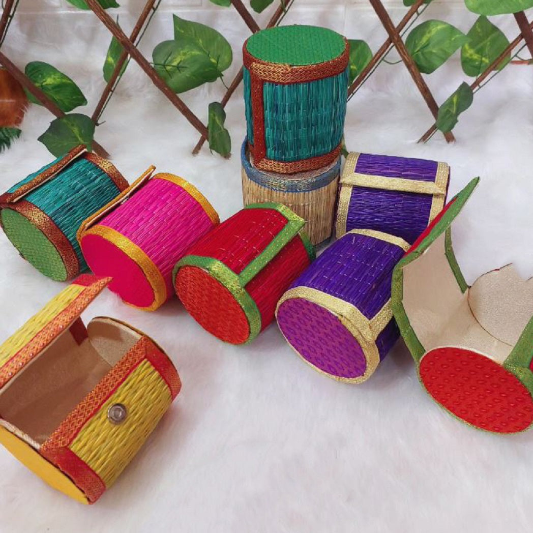 Keep your bangles organized and safe with this eco-friendly and stylish cylindrical Korai Mat Bangle Box. Handcrafted from traditional korai grass, this bangle box is a perfect blend of craftsmanship, utility, and sustainability, making it an elegant and functional addition to your accessories collection.