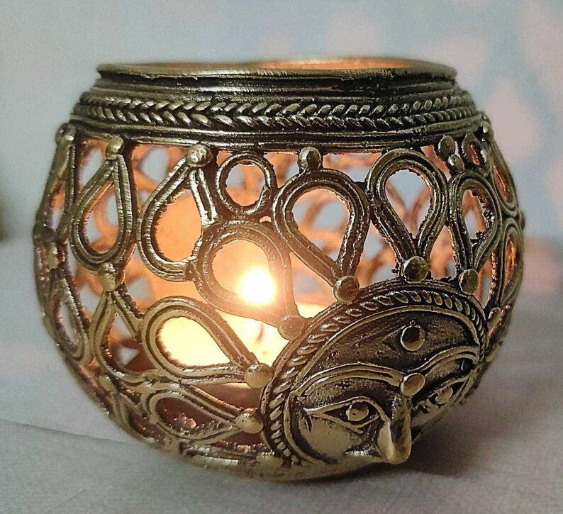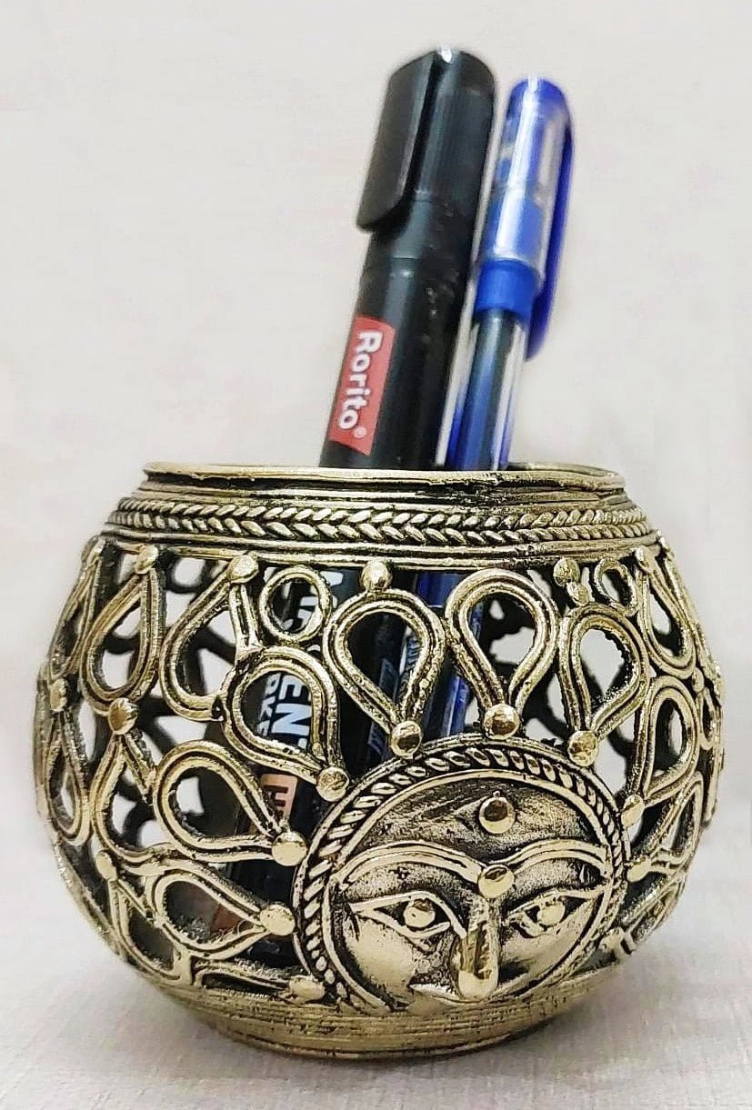 Embrace the beauty of Indian tribal art with the Dhokra Art Brass Sun and Water Droplets Pen Stand, a perfect blend of cultural heritage and utility. This pen stand is an exquisite piece, symbolizing the harmony of nature with its sun and water droplet motifs, making it an ideal addition to your desk or study area.