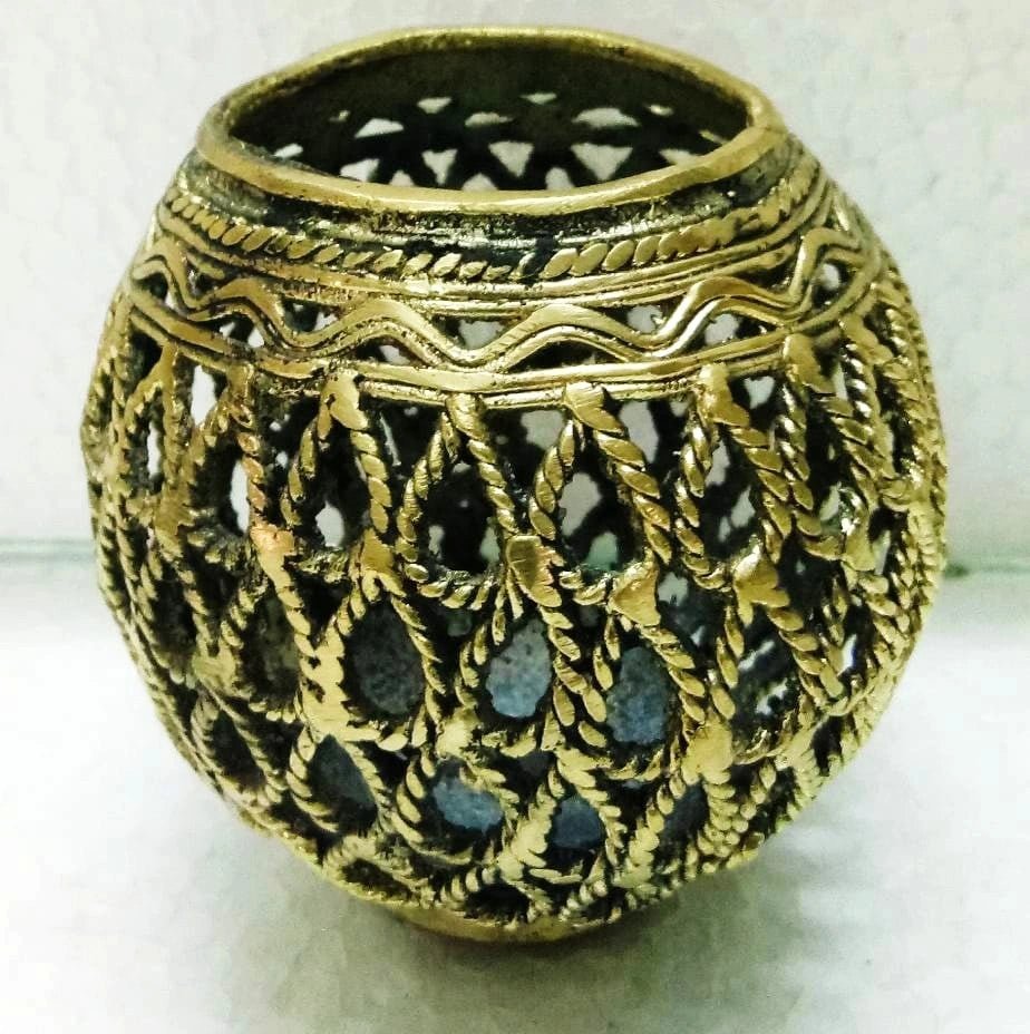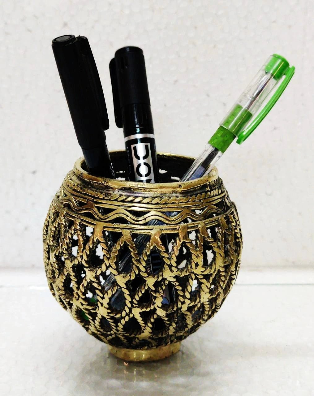 Elevate your workspace with the artistic and functional Dhokra Brass Water Droplets Pen Stand, a stunning blend of tradition and utility. This handcrafted masterpiece embodies the beauty of India’s ancient Dhokra art, making it a unique and elegant addition to your desk or office.