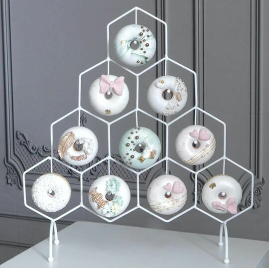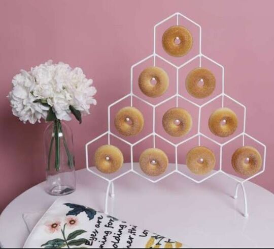 Our donut wall stand brings the sweetness on, by displaying your amazing donuts, bagels, party favors, cookies or any other delicacy you treat your guests to. Perfect for parties, catering, sweet 16, bridal showers, stadium food concessions, trade shows, Super Bowl team booths, dessert stations, donut bars/ shops & more.