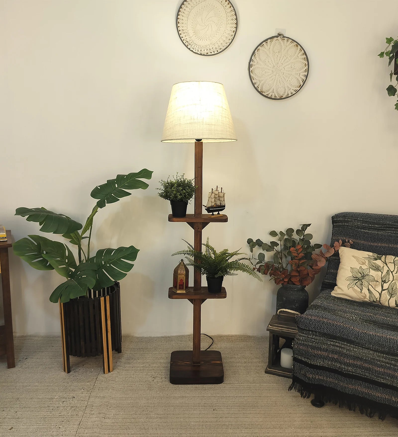 Elania Wooden Floor Lamp with Brown Base and Beige Fabric Lampshade