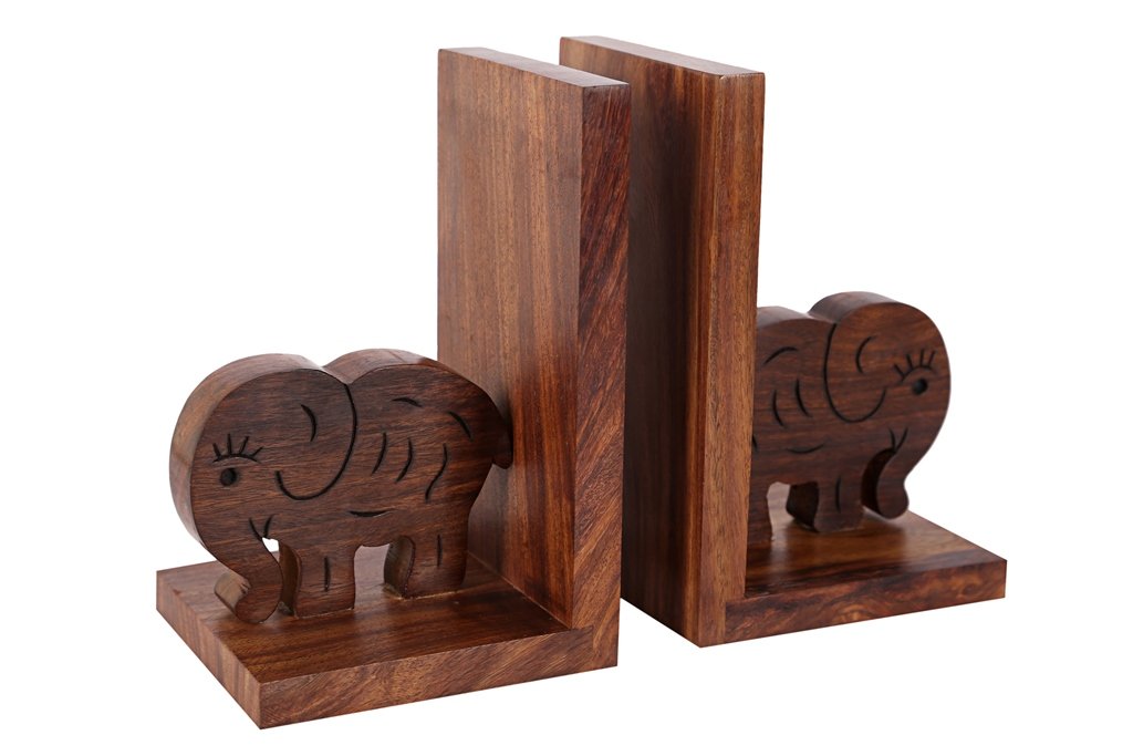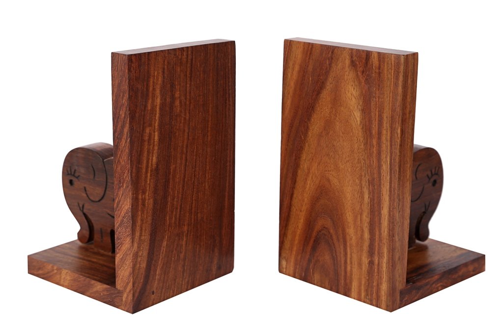 These bookends add a lovely accent to any shelf or bookcase in your home. They feature a polished sheehsam wood handcrafted elephant design on a brown wooden base that complements most any home decor. This set makes a thoughtful housewarming gift for a friend, and is sure to be admired.