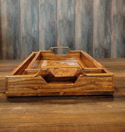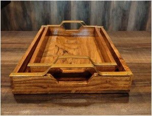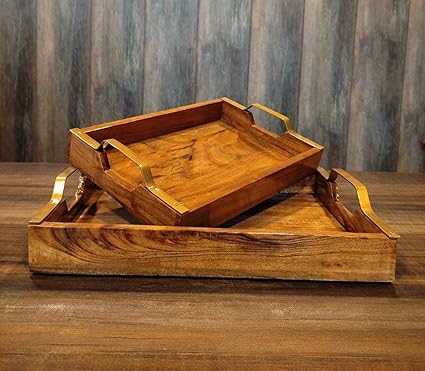 Serving Trays ( set of 2 ) handcrafted by RG SHOPPEE from one solid piece of Acacia hardwood. The product has its own unique look that enhances your kitchen's elegacy. We care for your health as we use premium quality food safe polish.NO STAINS || EASY WASH || FOOD SAFE.