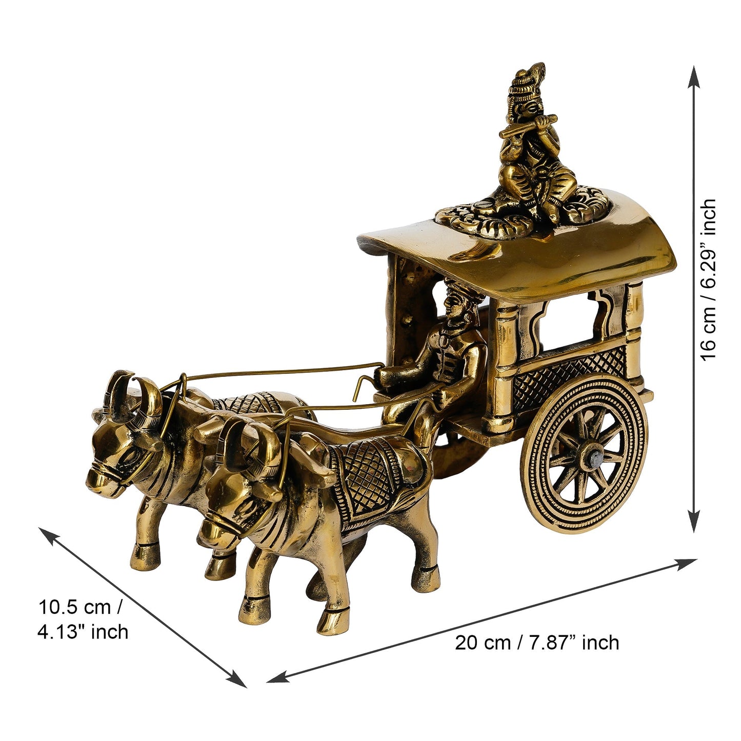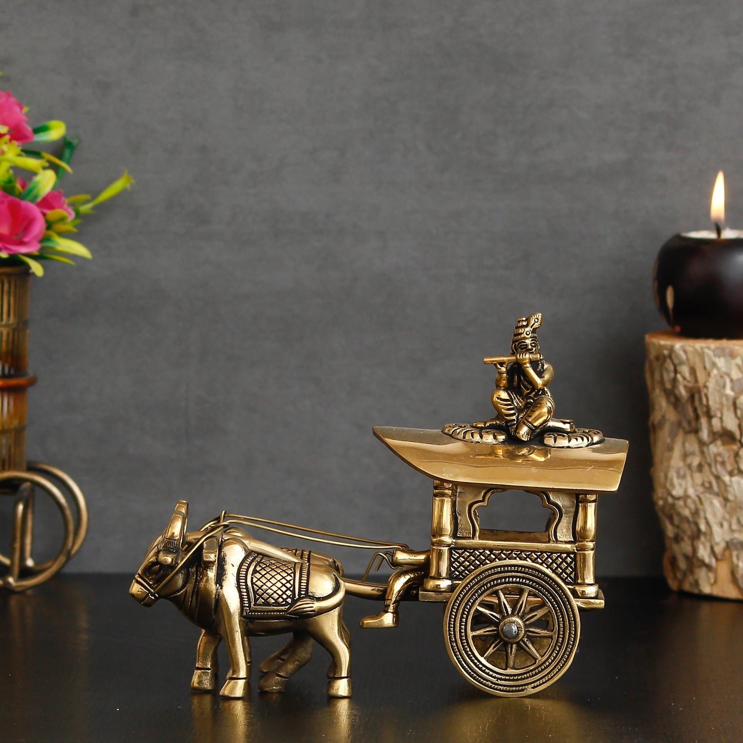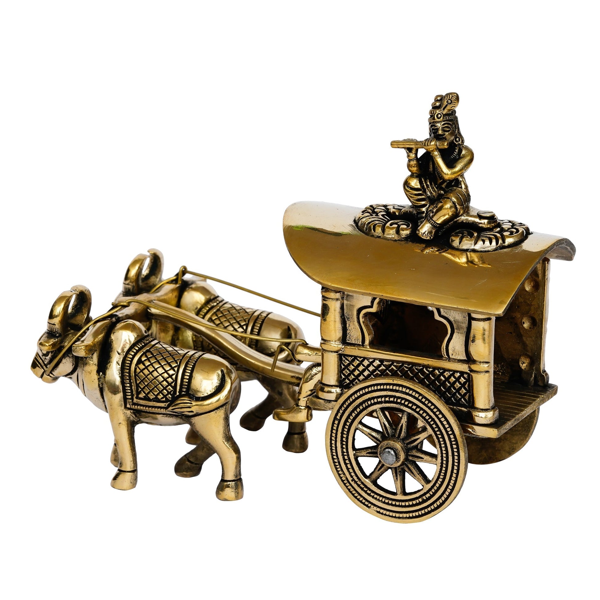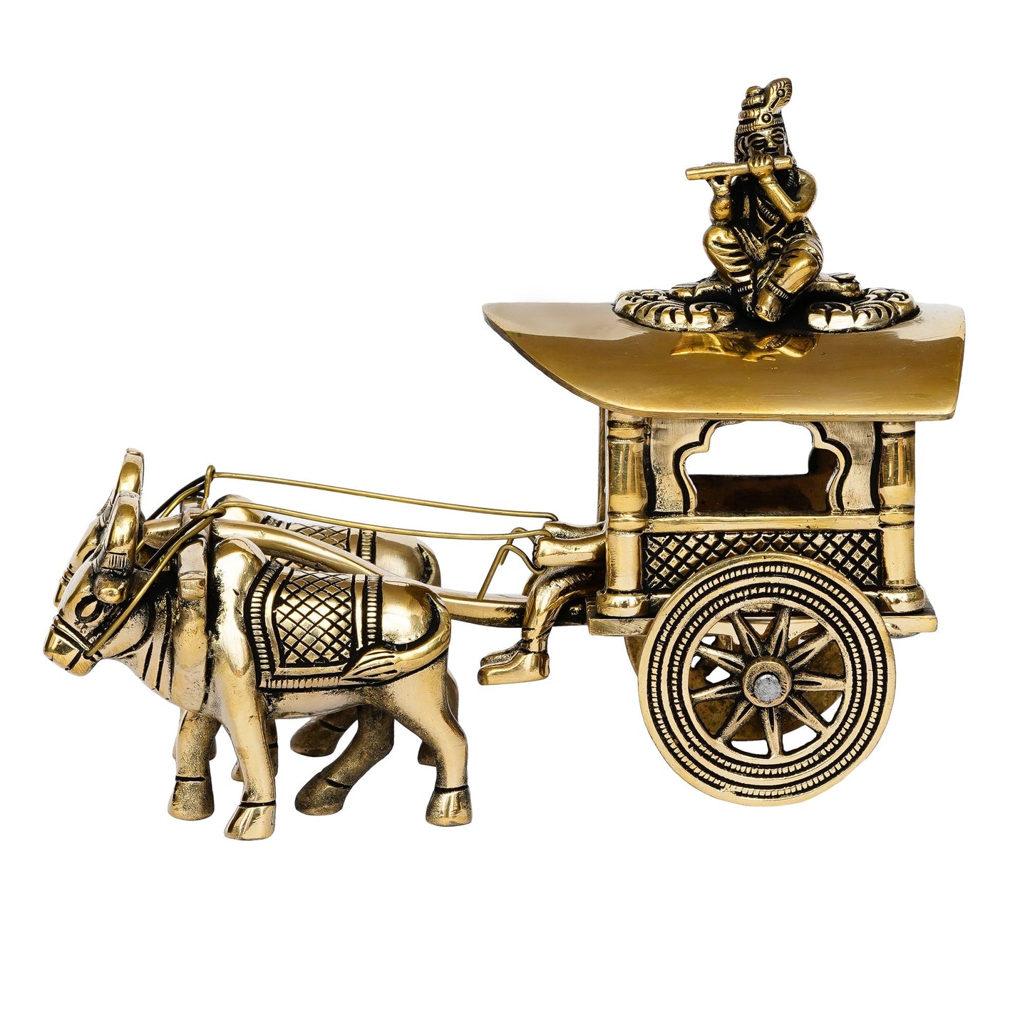 Golden Brass Lord Krishna Idol Sitting In Bullock Cart Showpiece