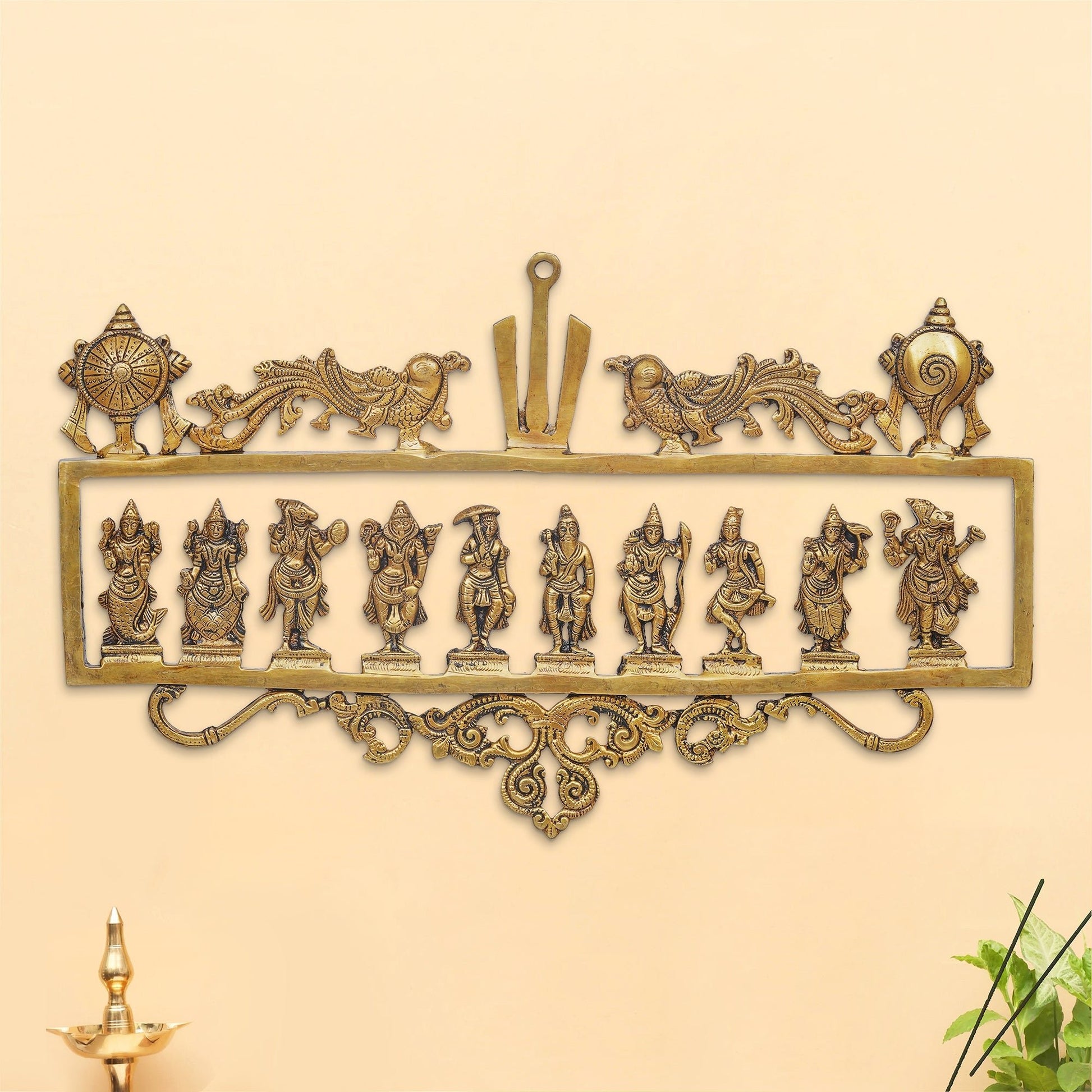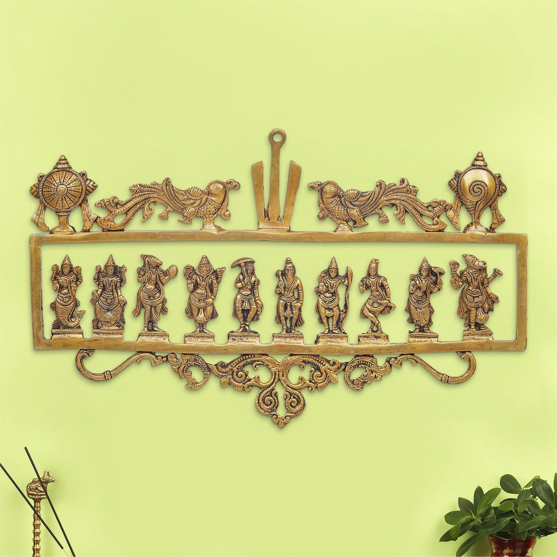 Golden Brass Vishnu Dashavatara - Ten Incarnations of Lord Vishnu Religious Wall Hanging