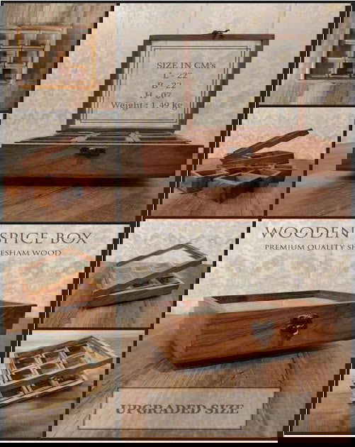 Introduce an element of elegance and functionality to your kitchen with the Handcrafted 6 Sheesham Wooden Container Spice Box. This exquisite spice box is meticulously crafted from high-quality sheesham wood, known for its durability and beautiful grain patterns, ensuring that each piece is unique.