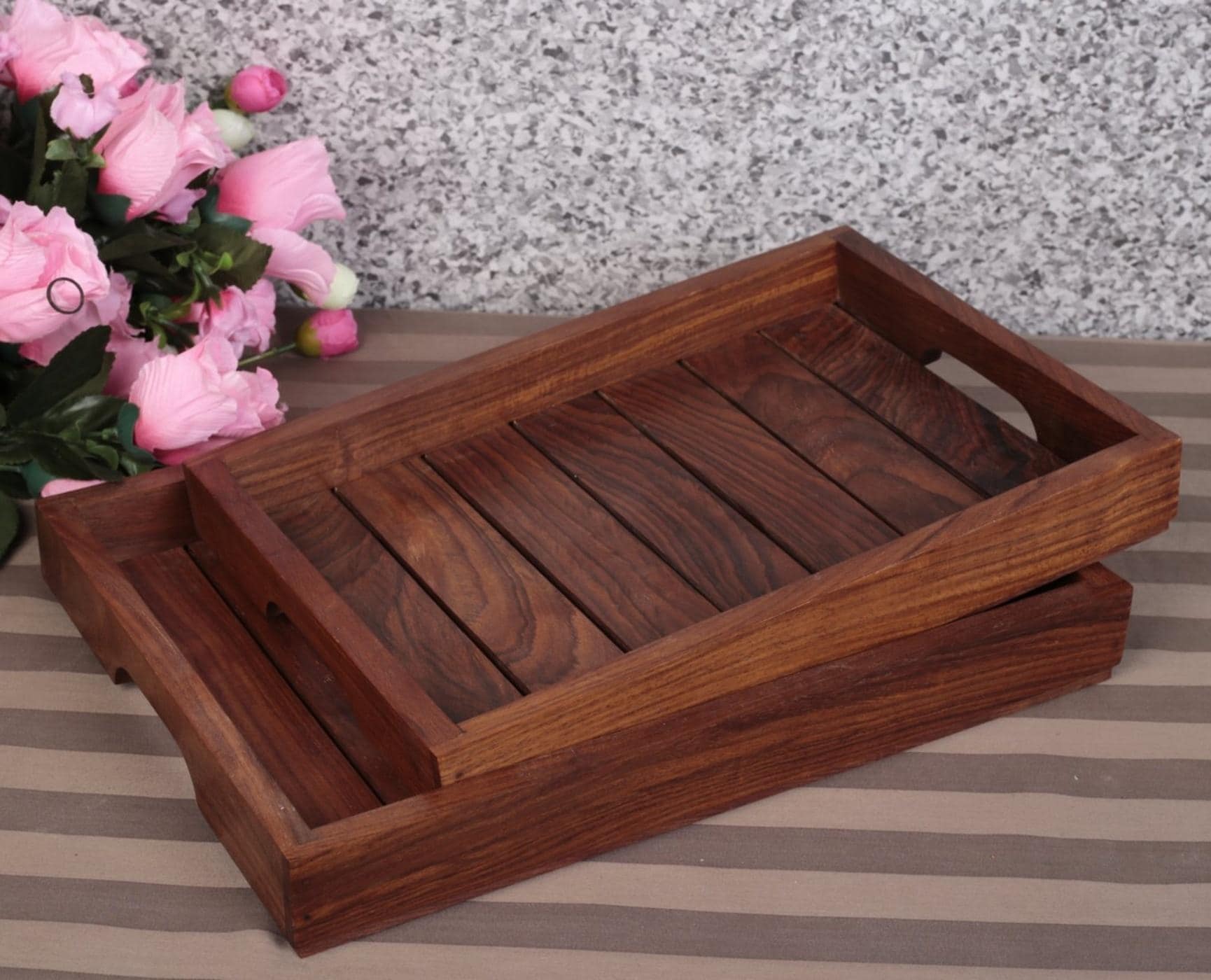 This set of two sheesham wood trays been crafted beautifully and giving it classy yet modern look. These trays gives an artistic addition to your tableware. Handcrafted to perfection, these sheesham tray set is in a distinctive rectangular shape, which is ideal for those who like to add simple yet classy things in their collection. Serve your guests in style and elegance with this authentically crafted tray. Features - it is used for a convenient carrying serving food and beverages to your guests.