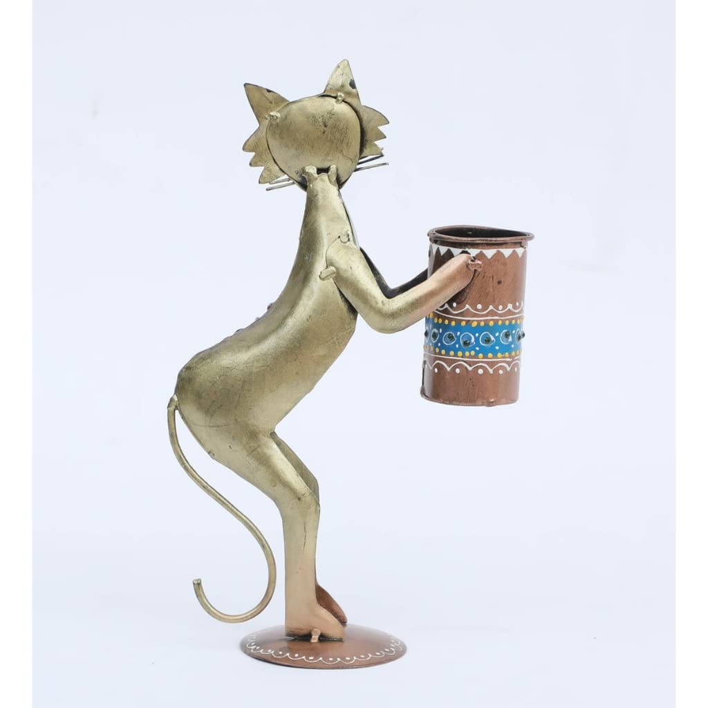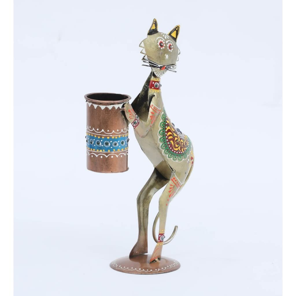 Hand Painted Cat Style Pen Stand - Pen stand for study table, Office, Kids, Girls, Office Table, Home - home decor item pen holder - Metal, Multicolour
