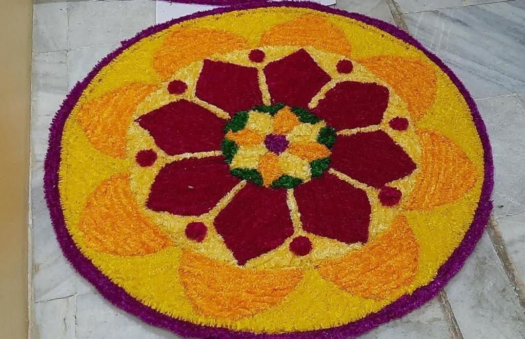 Features an elegant floral rangoli pattern in shades of yellow and maroon, symbolic of prosperity and festivity.