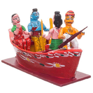 This handcrafted Kondapalli showpiece features the beloved characters of Rama, Sita, and Lakshmana on a boat.