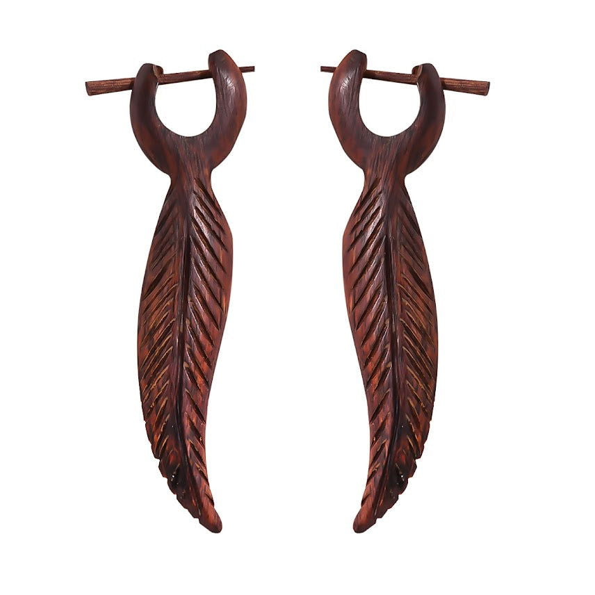 Leaf Carved wood dangle Post earrings 2.7"