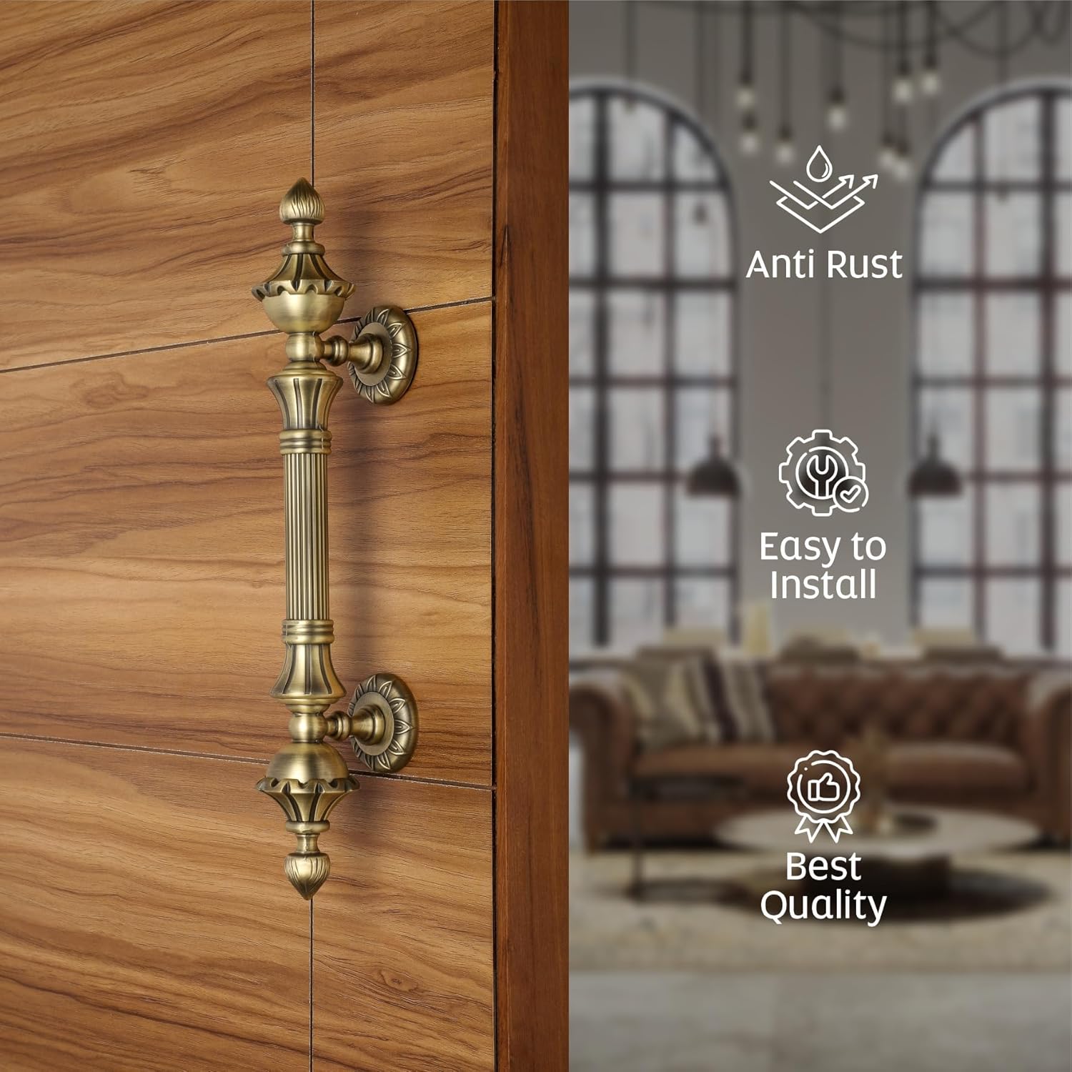 Crafted from high-quality zinc alloy, this door handle offers excellent durability, corrosion resistance, and long-lasting shine. The antique gold finish complements wooden doors beautifully and pairs well with classic, heritage, and luxury décor themes.