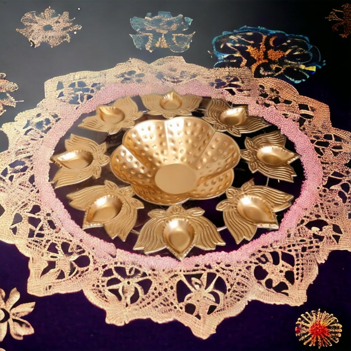 Diya and Rangoli Elements: The design incorporates space to hold diya lamps, creating a glowing ambiance when lit. The bowl can also serve as a base for a rangoli design, combining both light and art to form an enchanting display during festivals like Diwali, Navratri, or Pongal.