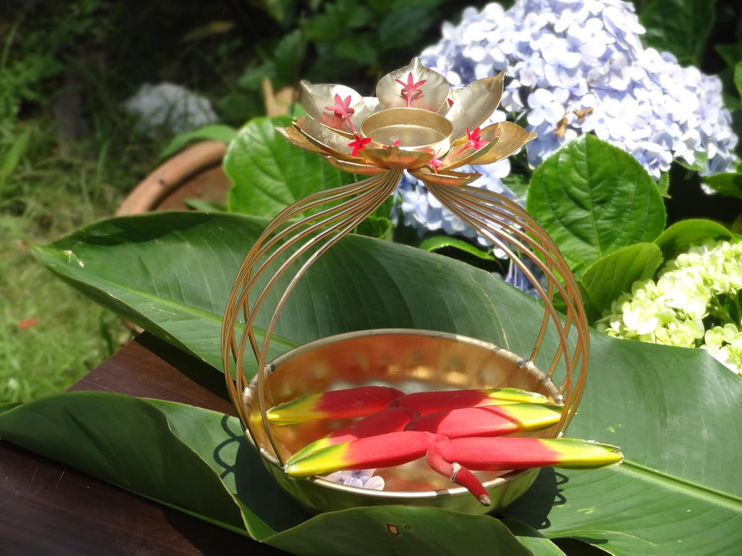 - Beautiful lotus-shaped urli with a central diya for lighting