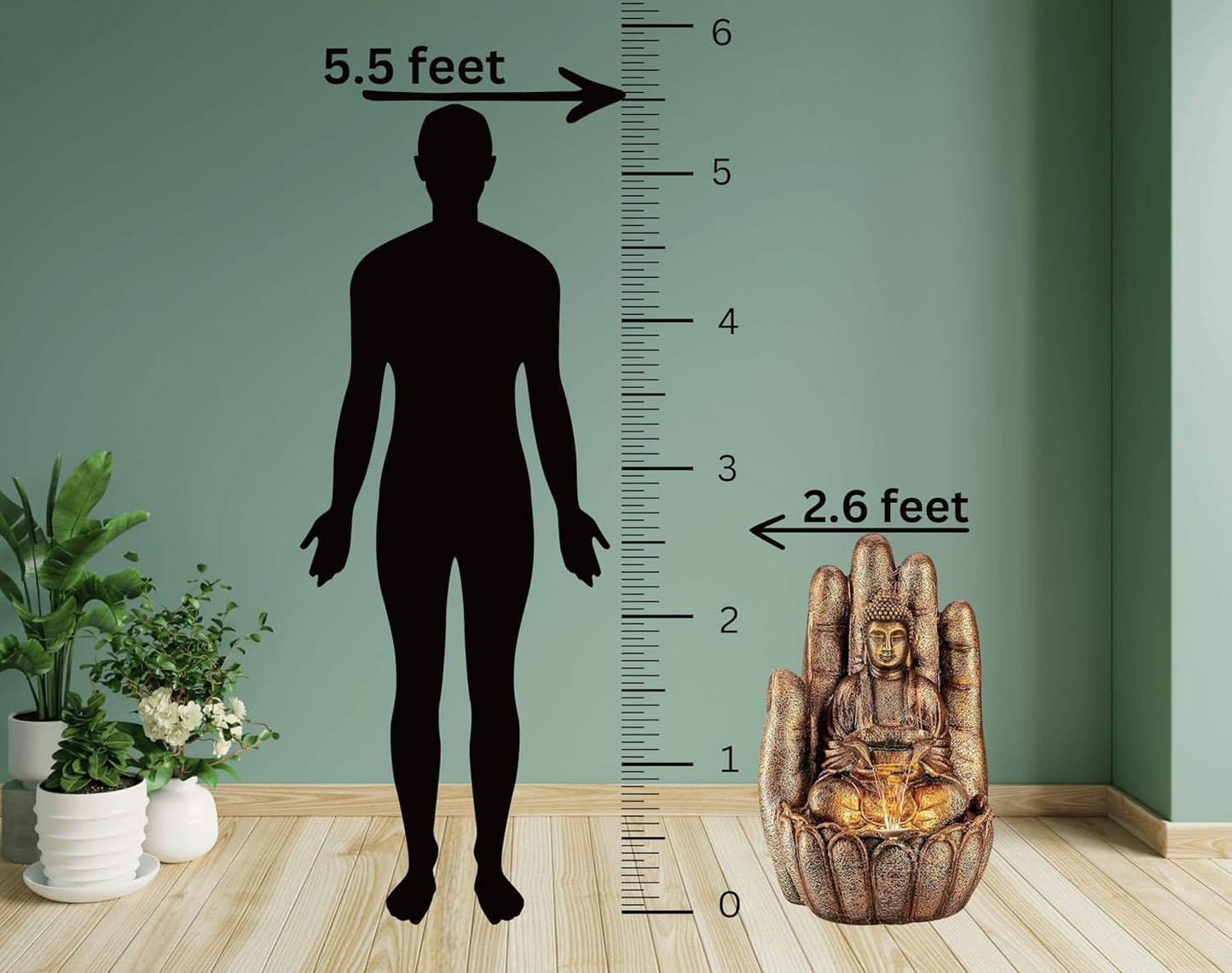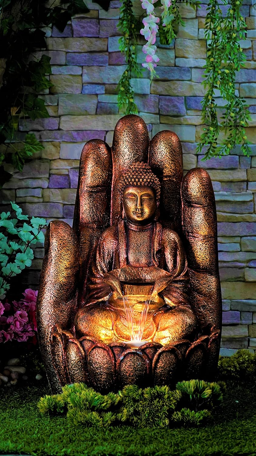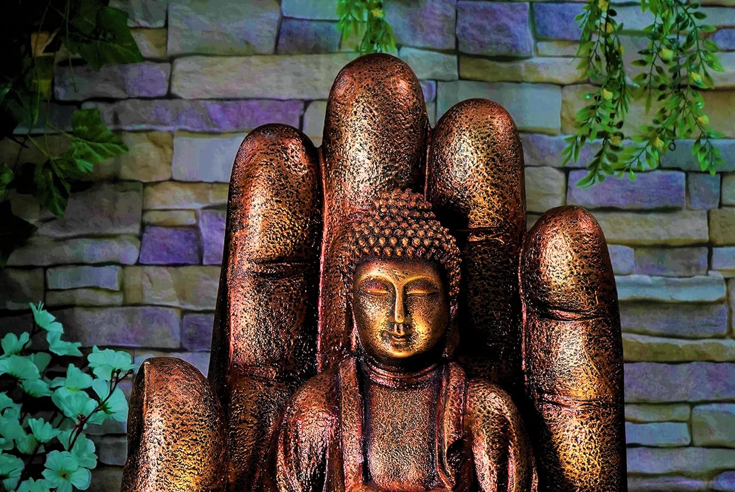 This palm Buddha fountain is perfect for your home or garden, feel the zen with the calm flow of water. It features a smooth waterfall as well as LED's to bring the fountain to life when it gets dark. Bring harmony, good fortune, and the vibrancies of the natural world to any environment. A nice flow of water creates soothing tranquility, and energy-efficient LED lighting generates mood-lifting effects. This fountain is made from lightweight resin construction so it is easy to set up and position.