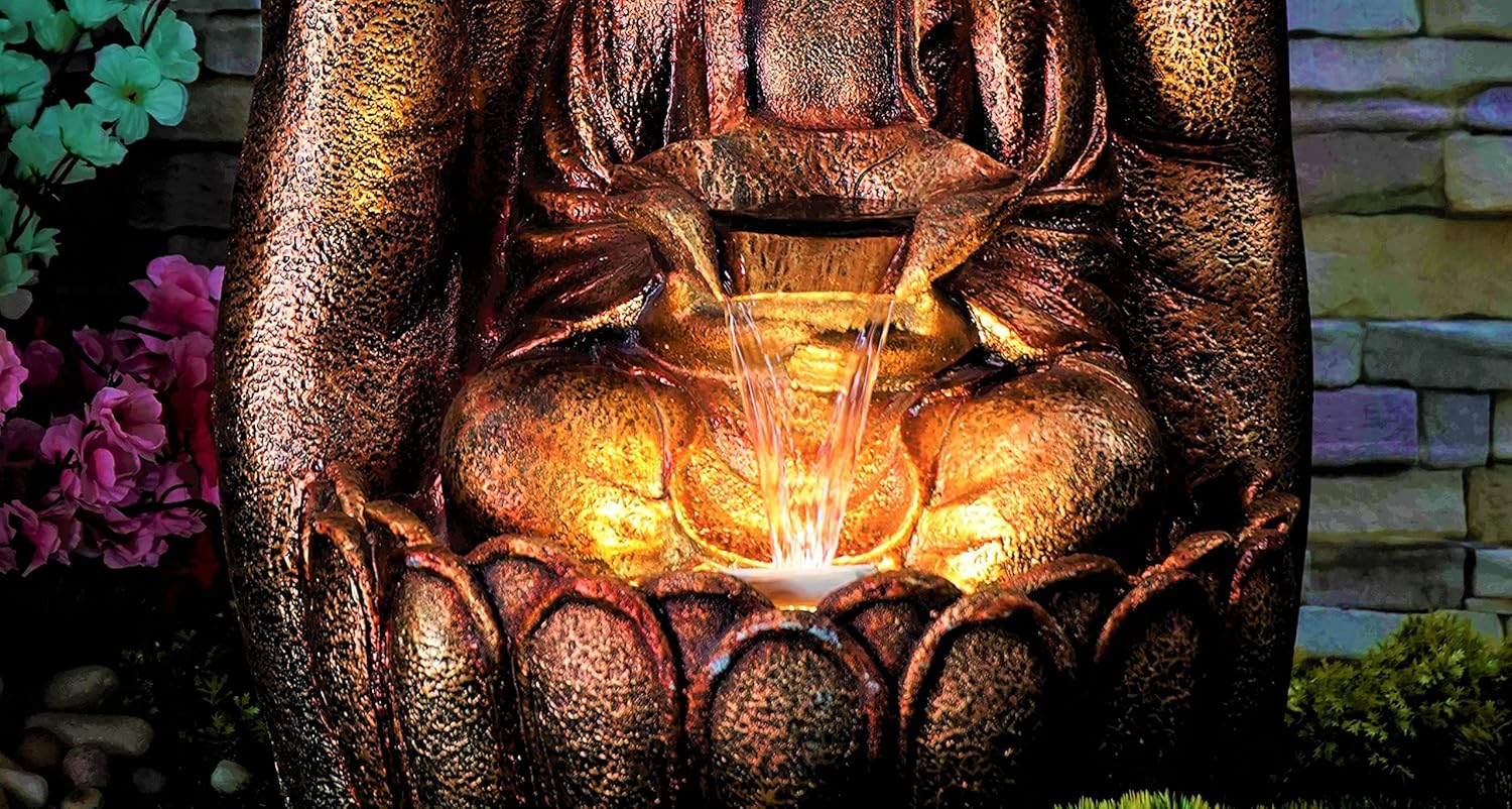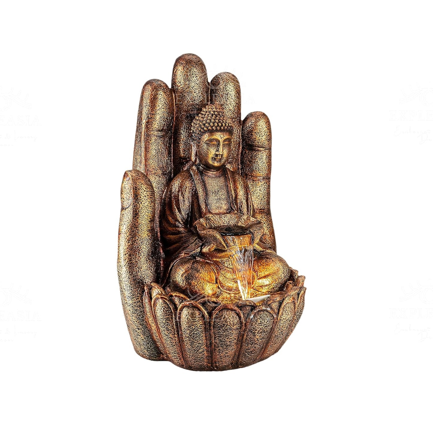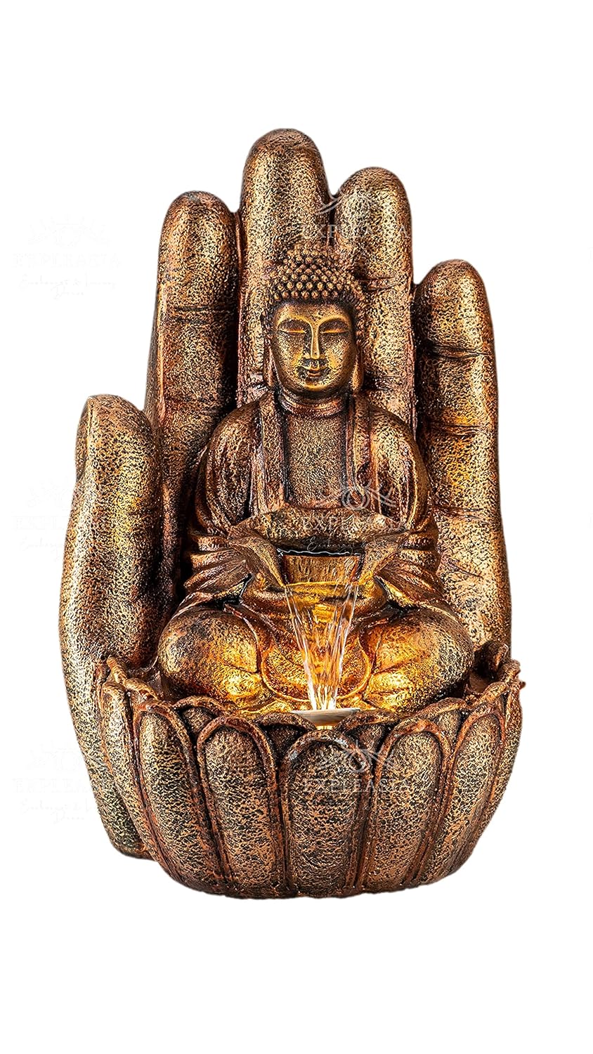 This palm Buddha fountain is perfect for your home or garden, feel the zen with the calm flow of water. It features a smooth waterfall as well as LED's to bring the fountain to life when it gets dark. Bring harmony, good fortune, and the vibrancies of the natural world to any environment. A nice flow of water creates soothing tranquility, and energy-efficient LED lighting generates mood-lifting effects. This fountain is made from lightweight resin construction so it is easy to set up and position.