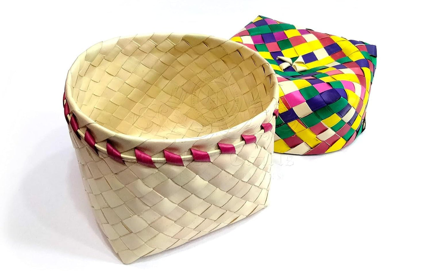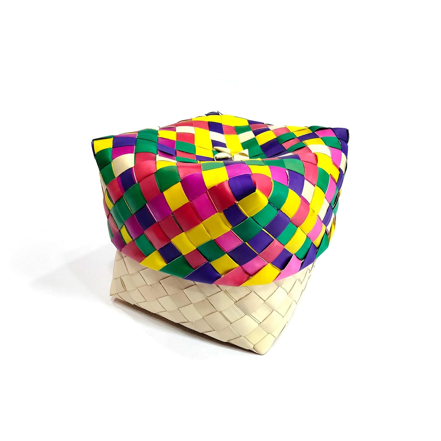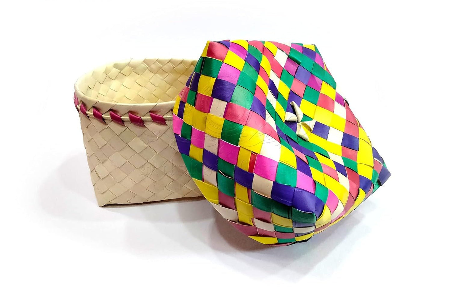 Lid: Features a vibrant, multi-color lid, adding color and style to the natural palm leaf base.