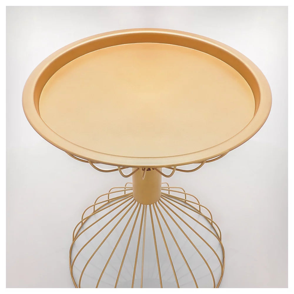 The Round tray table in gold is an art piece. With its hourglass-shaped cage and matte-iron surface, it is modern and spacious. Its perfect as a coffee table, bedside table, or side table as it fits everywhere.