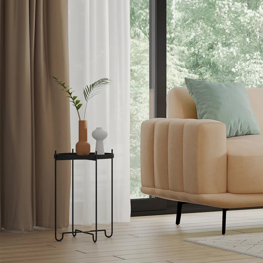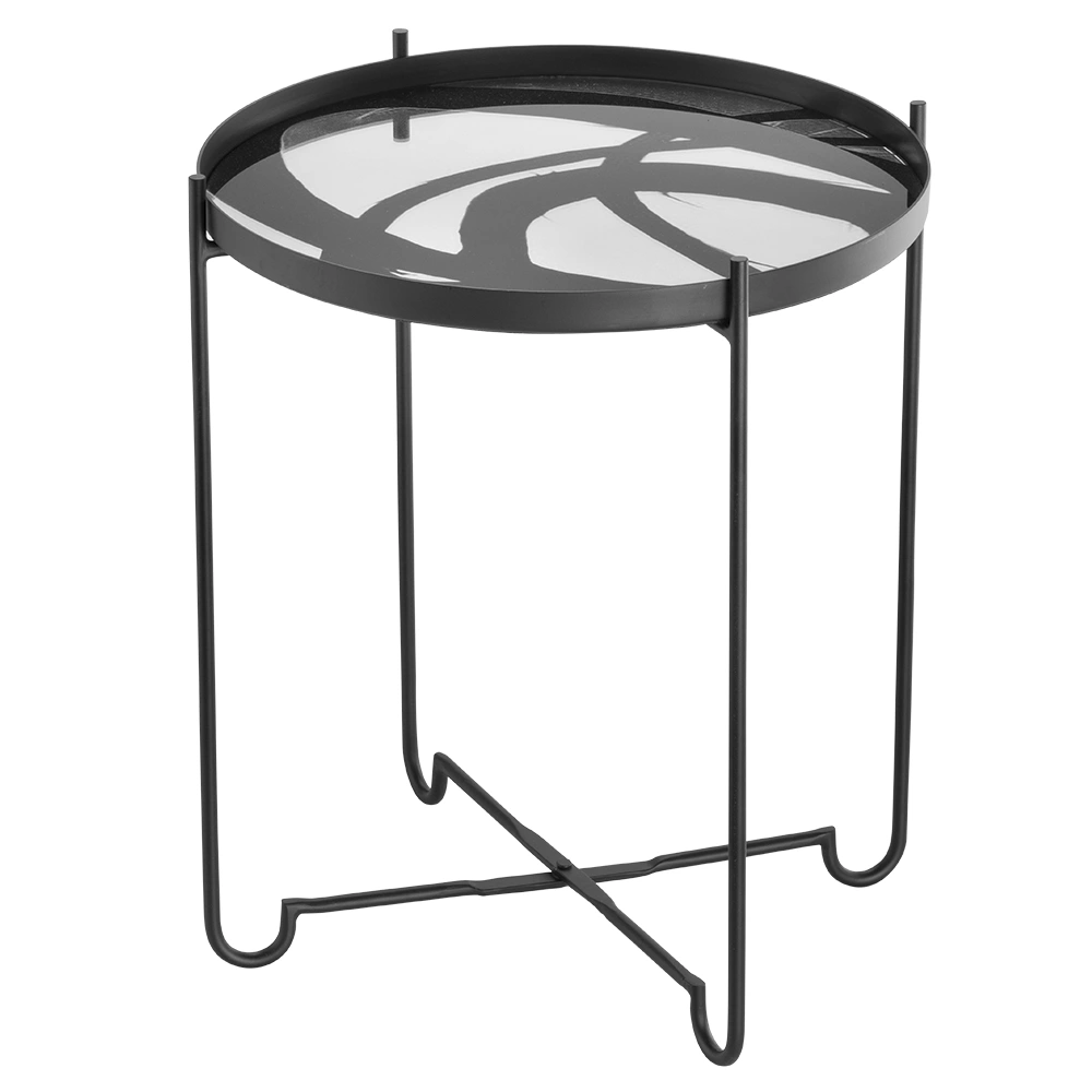 This is versatile side table crafted with a sleek black powder-coated iron frame and durable glass. Its detachable tray design allows for easy use and seamless reattachment, blending style with practicality.