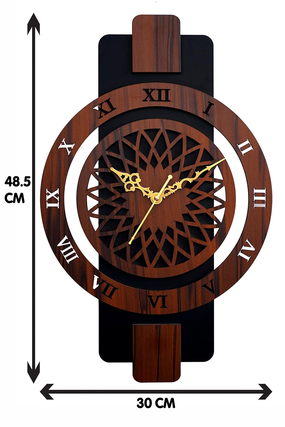 This stylish wooden wall clock makes a beautiful addition to any room in the home. Crafted from MDF wood with a classic Roman numeral dial, it brings vintage charm and character. Measuring 30 CM in diameter, its generous size ensures the time is easily visible from anywhere in the room.